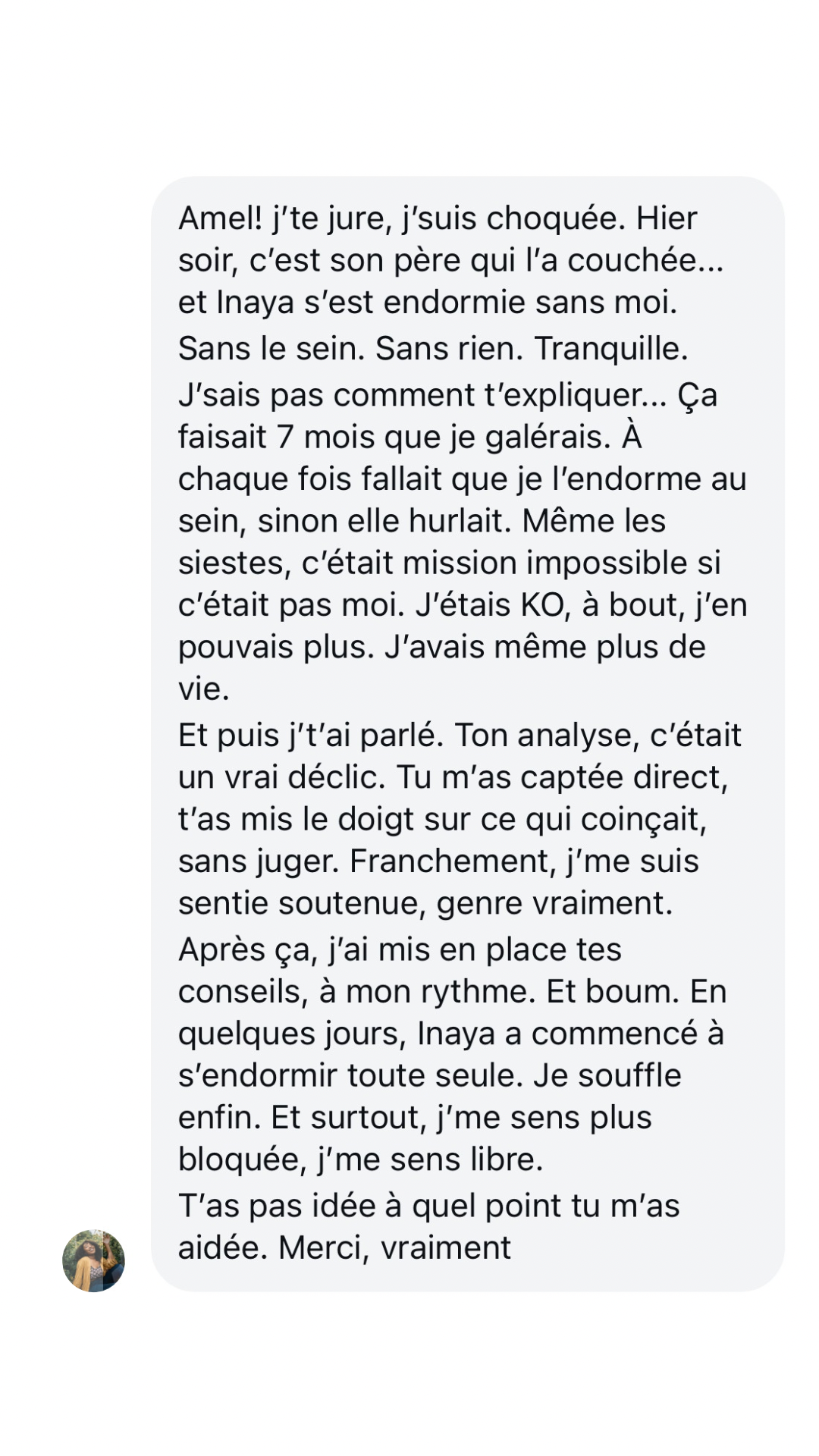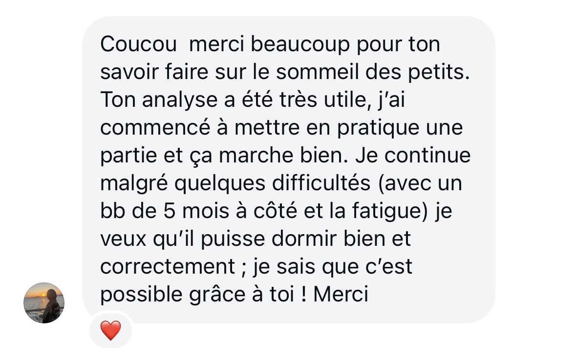 Âge: 7 mois, endormissement dépendant du sein. Difficulté à confier l’enfant à quelqu’un d’autre pour les siestes ou le coucher. Réveils fréquents la nuit (3 à 4 fois)